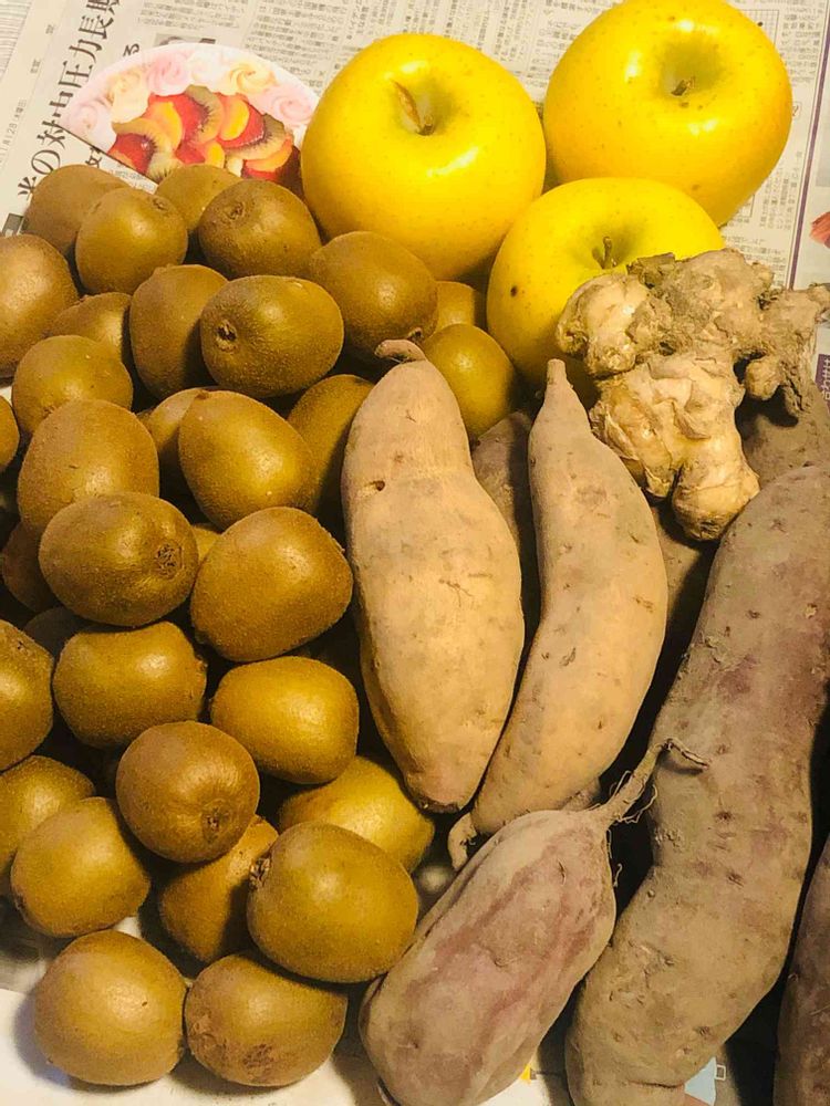 ずっしり重い箱の中からはキウイ🥝 (キウイはこの倍くらい入っていました🥝🥝🥝🥝🥝🥝)やりんご🍏さつまいも🍠など ゆずさんが収穫してくださった 美味しそうなものかてんこ盛り❤️
