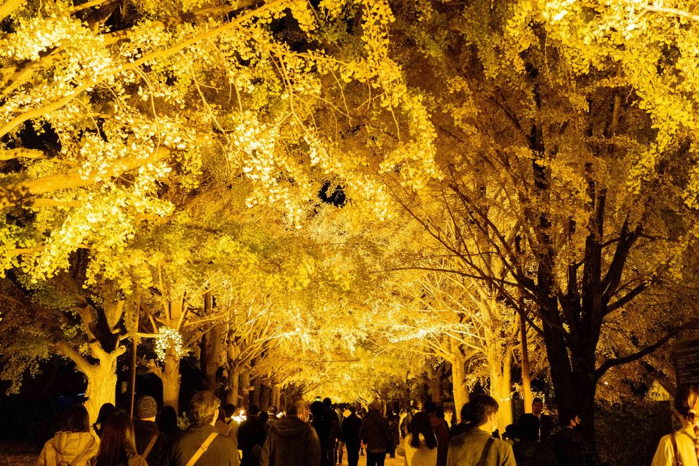 銀杏並木のライトアップです。ライトが黄色のため人も黄色く映ってます