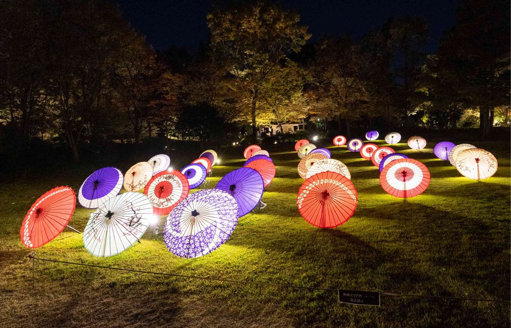 カラフルな和傘がライトアップされていました。