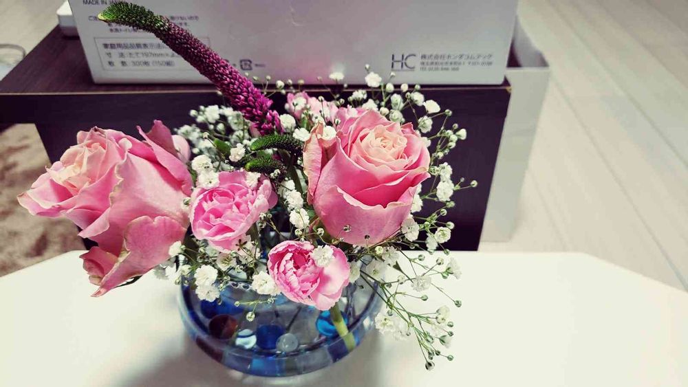 ビー玉で茎を固定するから意外と花がずれなくて飾りやすかった。