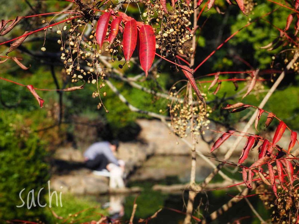 池の上の「ハゼノキ」と親子…