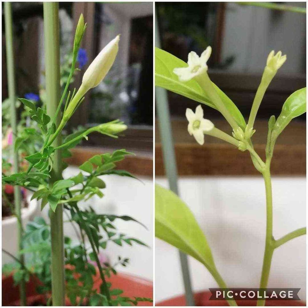 さっき…、冬越し用の🌱2階に上がったら😃ナイトジャスミンの小さい花が開いていました🥰香りも小さいながら確かに香りました🌼