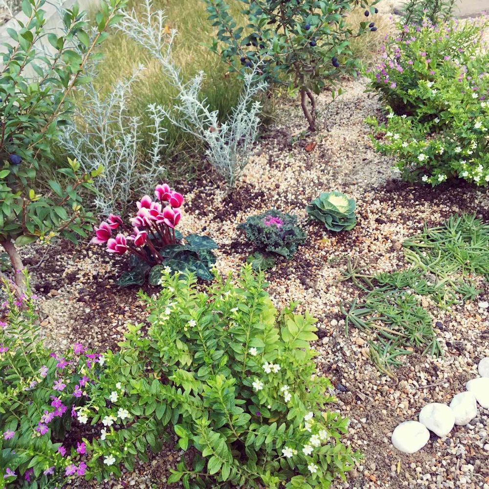 エントランスの横を、ガーデンシクラメンとハボタン、エレモフィラ・ニベアを加えて、少しだけクリスマスandお正月雰囲気にお庭を変身。