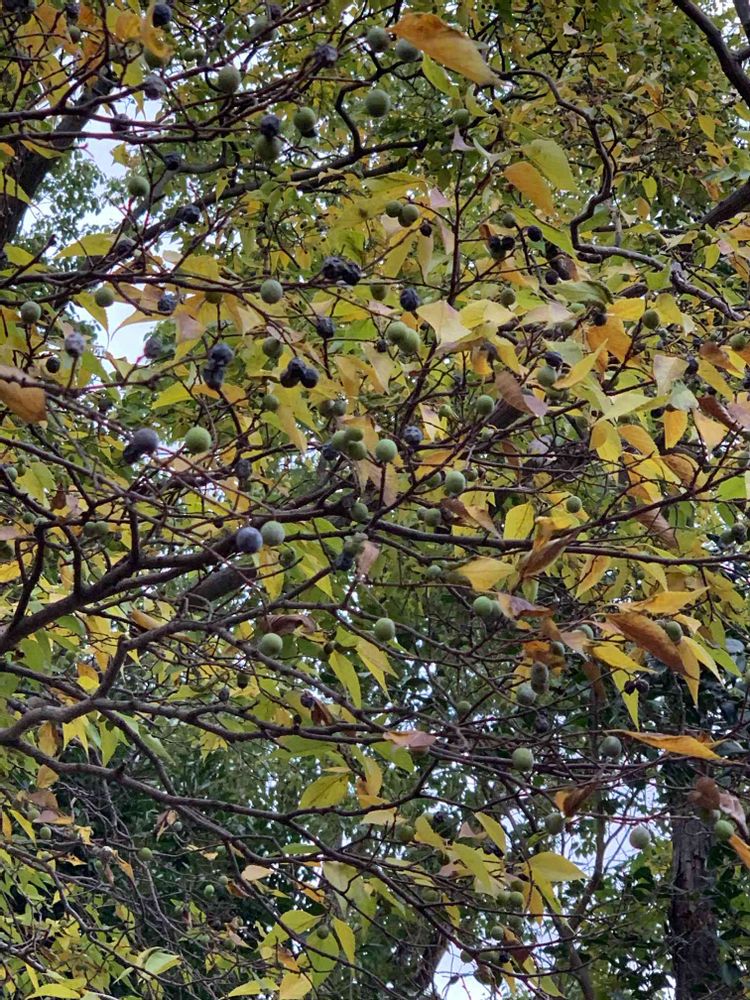 よく似た木、ムクノキ(椋)の実がやっと黒く熟してきました。