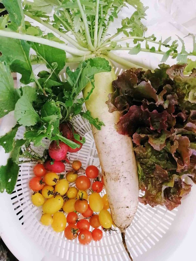 今朝の収穫。朝食のサラダとお味噌汁用に。