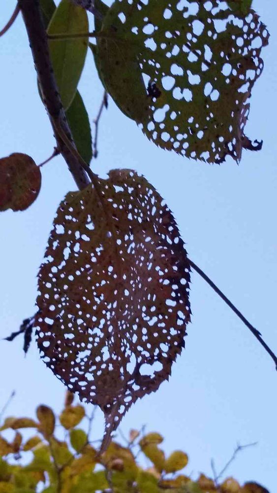 芸術的に食べてくれました😅毛虫でしょうか?🏘️の裏側なのと下に生える草に気をとられて気付きませんでした。生えてる葉っぱみんな穴だらけでーす❗️ホント😆