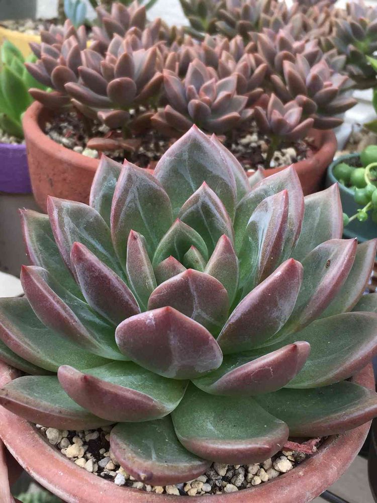ここ数日でまた赤くなった❓干し柿みたいに白い粉が😊👆ウォーターマークが素敵❤️天候に左右されながら健気に頑張る多肉ちゃん達☺️✨みんな違ってみんな良い❤️