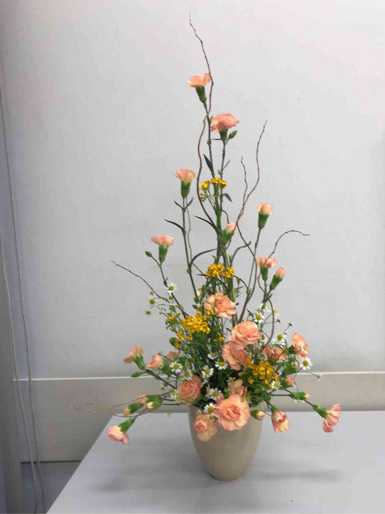 10/29に投稿したアレンジと同じですが花が違うとイメージが随分と変わります。こちらは、カーネーションです♪