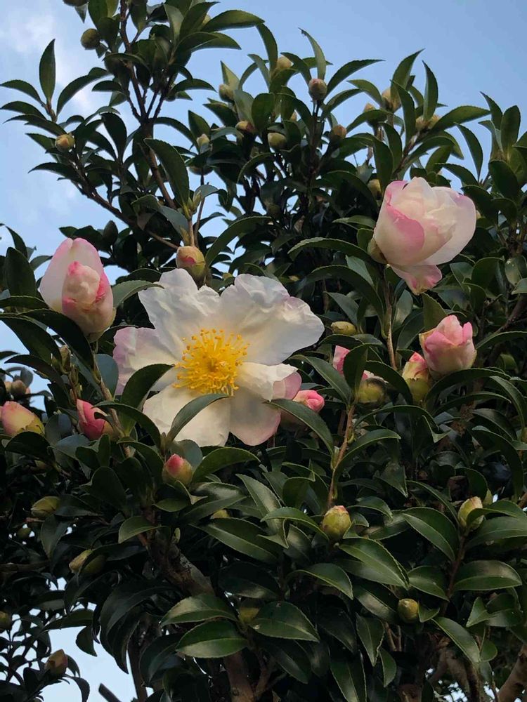 このサザンカさん、白だと思い込んでました。こんなに可愛い😍ピンクの縁取りが❣️