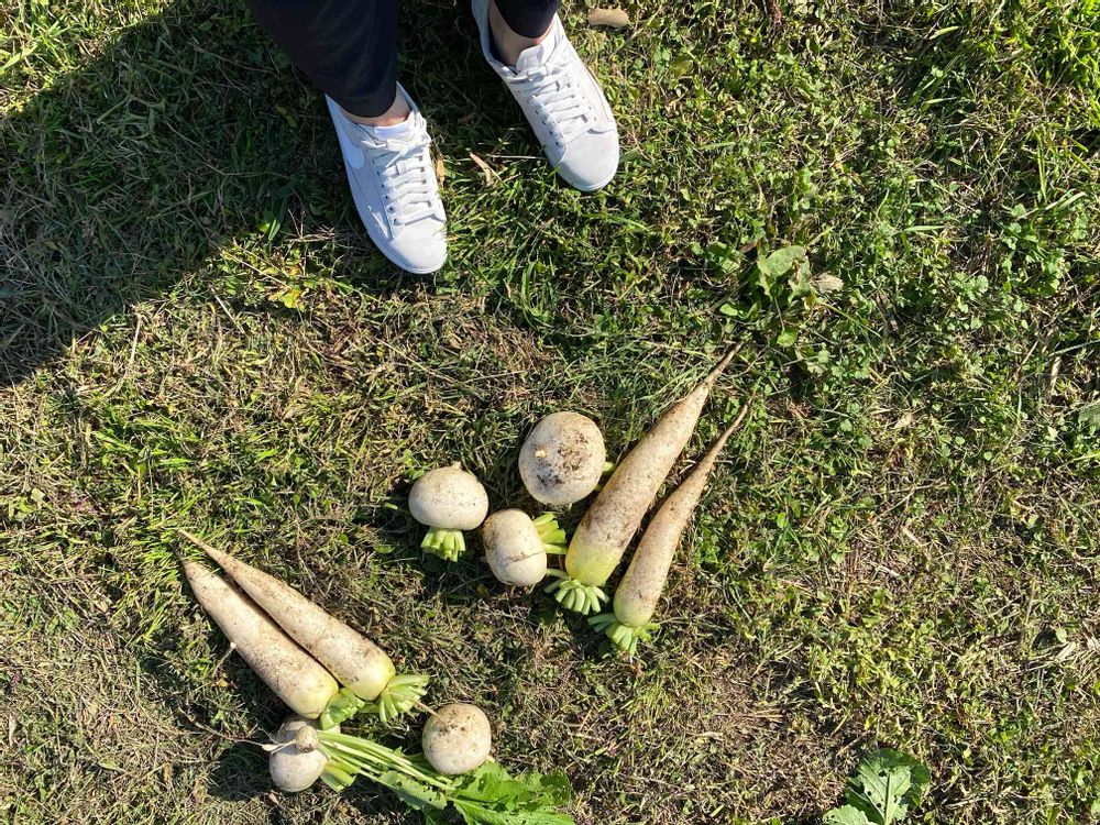 無農薬で作られたてんとう虫がたくさん着いた大根とカブを収穫しました