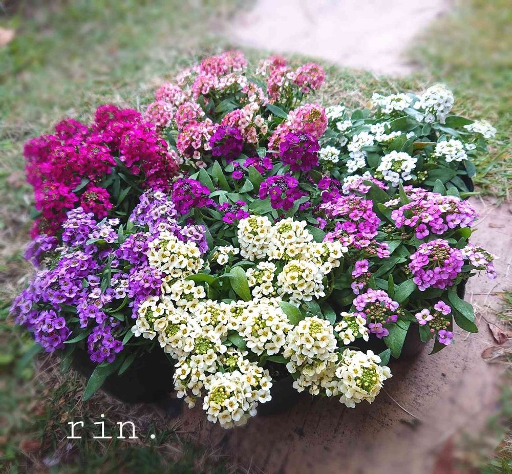 アリッサムは無条件で可愛いよね‼️りんさんの腕前でどんな風になるのか楽しみだわ‼️私もミックスアリッサムオンリーで吊り鉢に植えてゆらゆらさせてるの💜💗💚ʚ♡ɞ(ू•ᴗ•ू❁)ウフフです😌💓