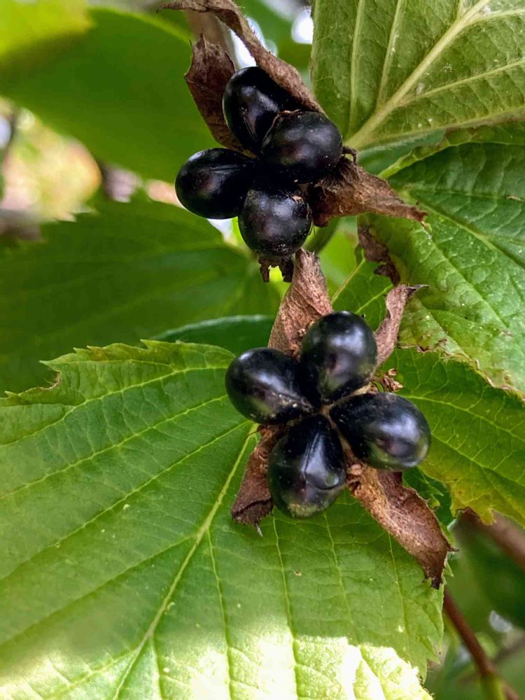 黒い実が4個まとまってつきます。