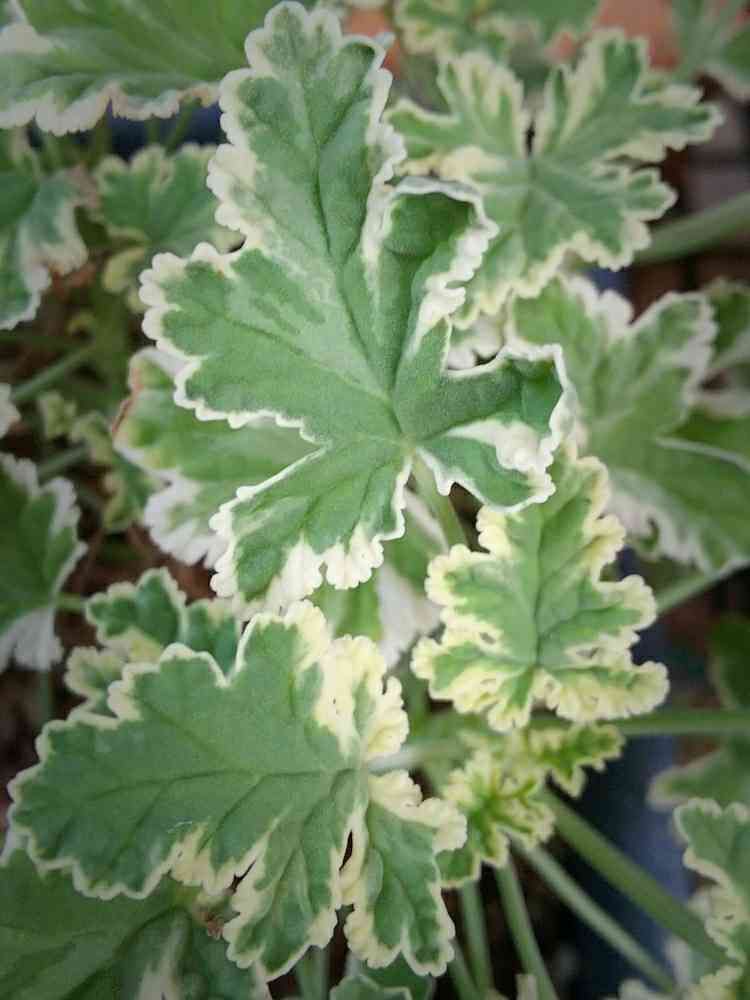 細かな切れ込みを持つ葉の形、クリーム色の縁取り、