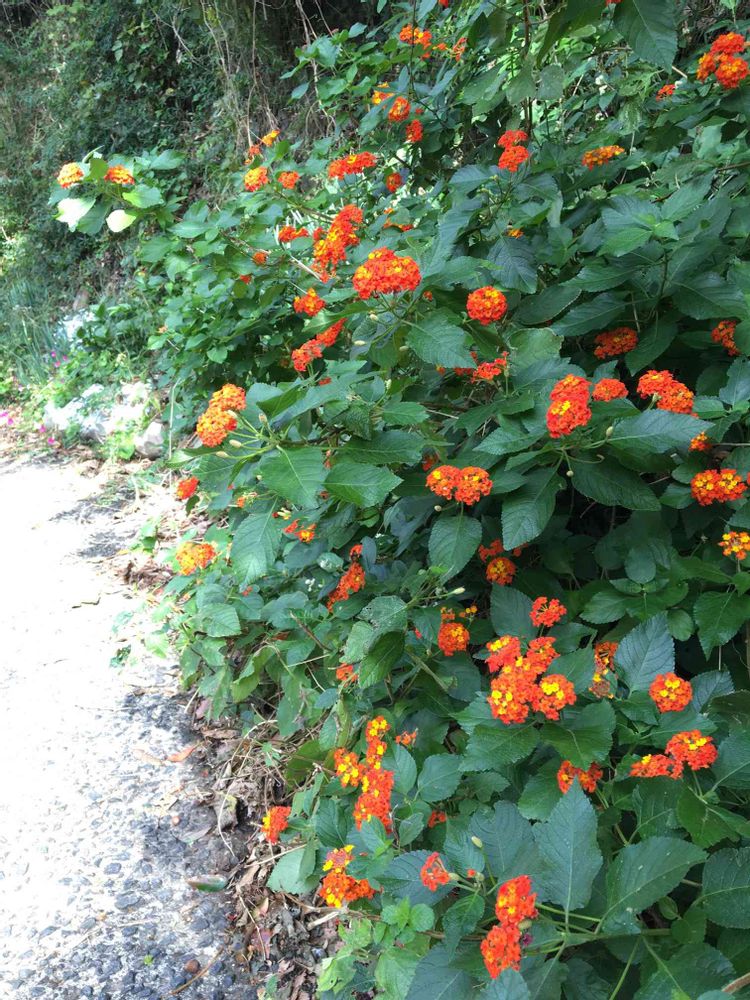 散歩道です。一輪づつ違う顔したオレンジのランタナが、まだまだ元気に咲いていました♪