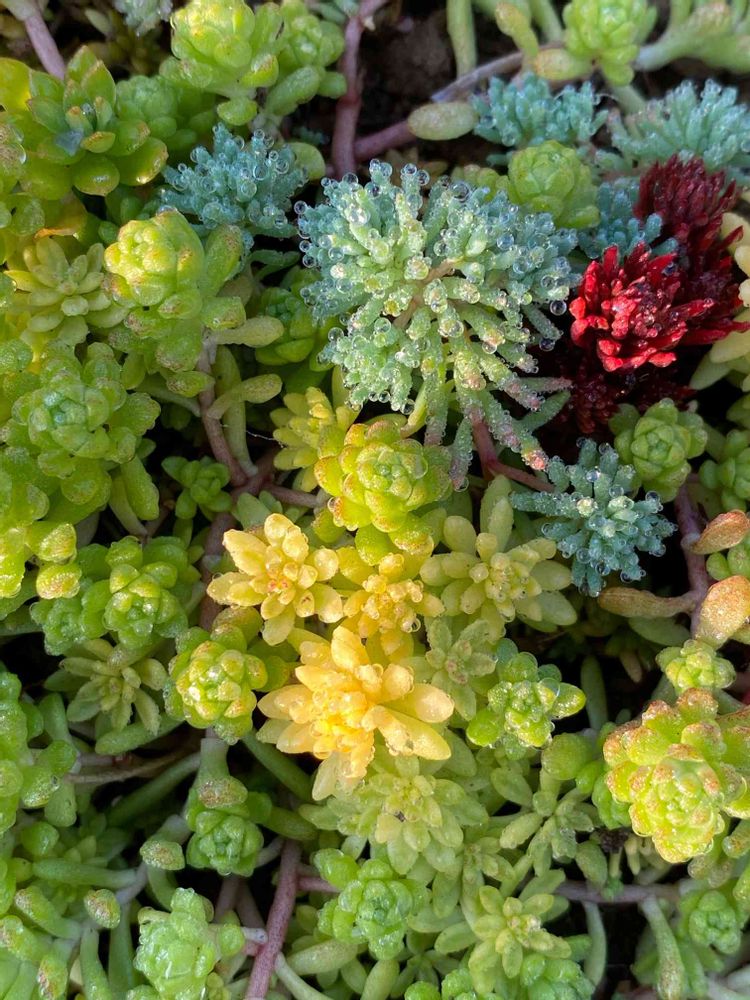 色々なセダムたちが朝露の光でキラキラしてとても綺麗です。