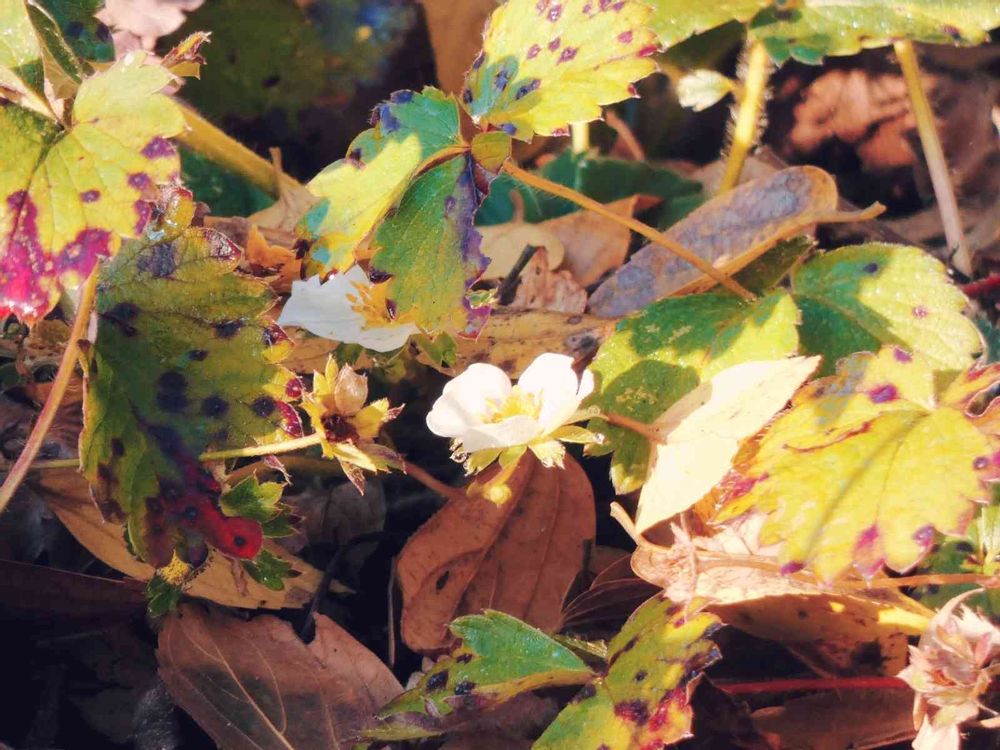 落ち葉たちが、いちごの花💠を温めてくれています。