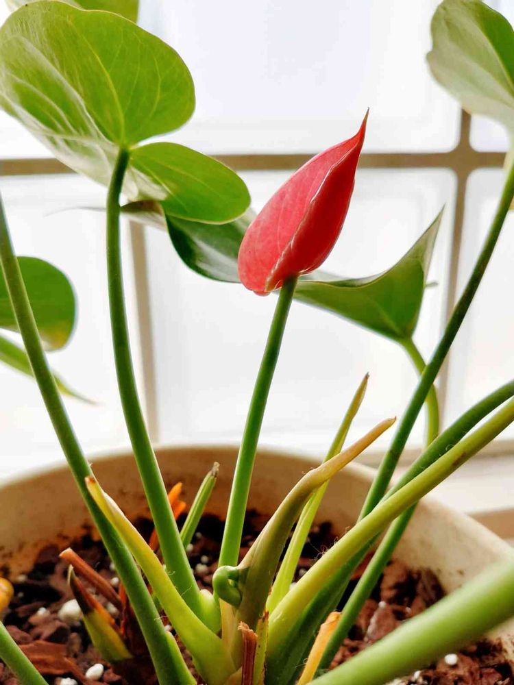 かなり葉っぱが落ちて元気のなかったアンスリウム。一か八かで植え替えてから新しい花芽と葉っぱが🌿😀