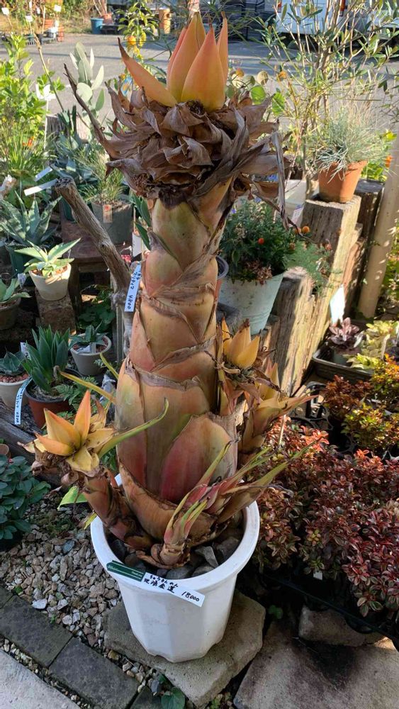 『中国秘境の地に自生する植物「中国雲南省の地に湧く金の蓮」と言われる伝説の花で背丈は70cm程 パイナップルより少し小さめの蕾は茎の先端に蓮に似た黄金色の花弁のような「ほう」の隙間から幾つもの小さな花を咲かせる』との事です😅