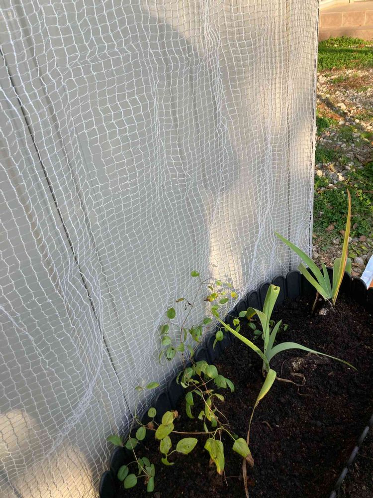 家横のストレージ、南側の壁にクレマチス'プリンスチャールズ'とジャーマンアイリスを植える。'カラスよけネット'なる物がジャストサイズで、右壁から屋根を覆い左壁までぐるっと回し固定した。この白色も色が馴染み悪目立ちせず、澄んだ寒色のクレマチスが映えると思う。ただの物置きが、とても素敵な物置きになるのを夢見て...