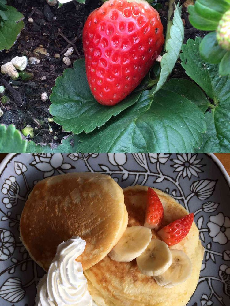 美味しそうなパンケーキ🥞とかわいい初収穫イチゴ🍓、こちらまでおすそわけ頂いた気分です😊
