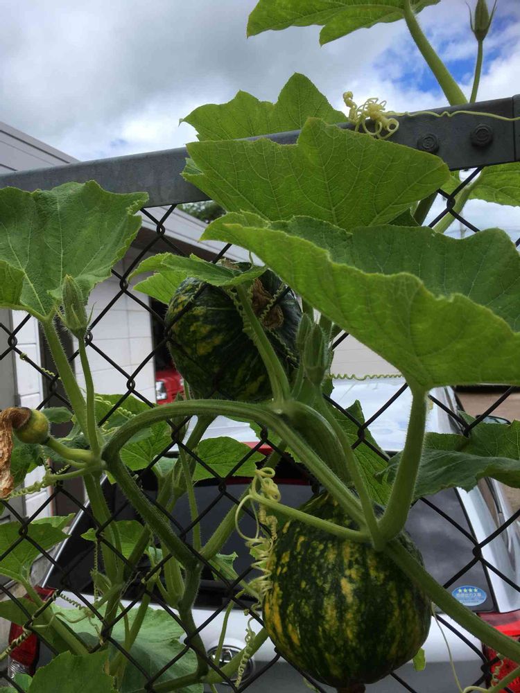 郵便局のフェンスに巻き付いて、かぼちゃが2つなってる!
