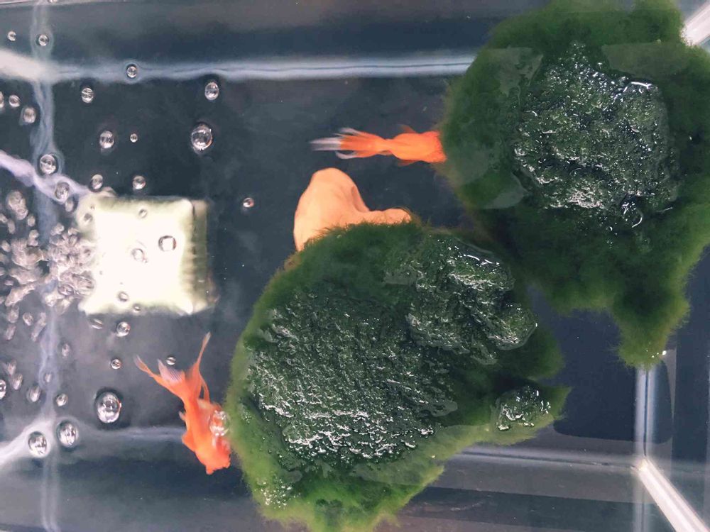 いやいや、マリモは全くコンパクトにはなってません。金魚の食べる分なんて、たかが知れてますもん。金魚の食いちぎって切れた分のマリモはまた成長するんですよ。驚きでしょ?