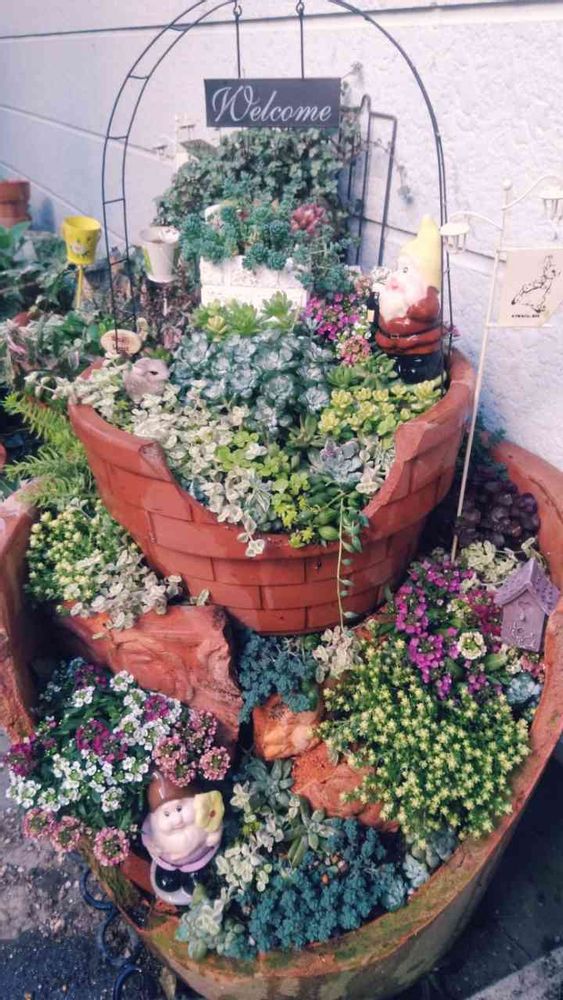 割れ鉢にセダムやアリッサムの段々畑を作ってみました。