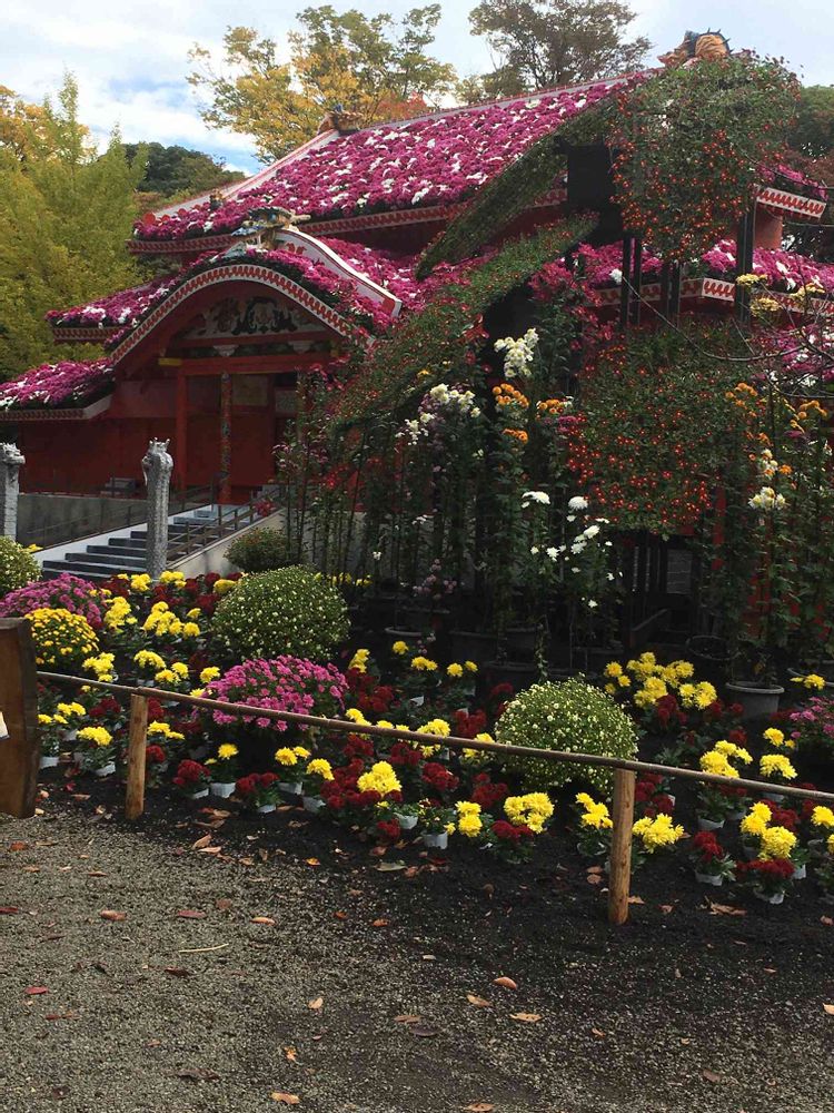 さん、屋根が菊ですね〜。この建物いがにも色違いがありました。モチーフは首里城ですね。復興を願って!