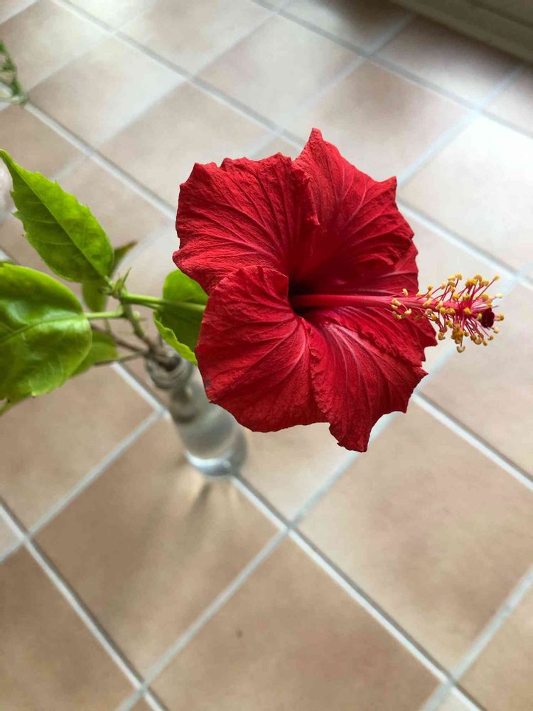 数年前の見切り品が植え替えの度に大きな鉢にしたら、年々大きくなり、私と同じくらいの丈に、、、今年冬越しの前にバッサリ✂️半分に。まだ蕾ちゃんがあり、可哀想だから、一輪挿しに。ガラス越しのお日様に向かってパッと咲いてくれました。