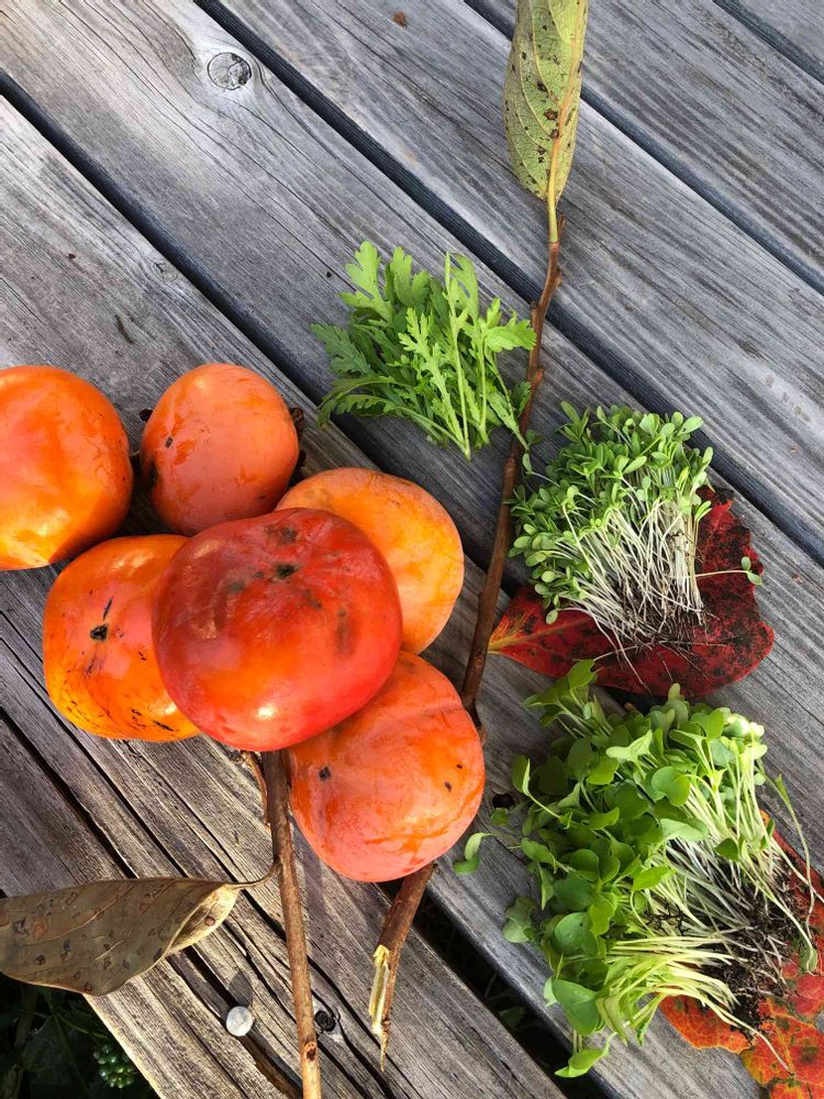 すえすえさんの春菊,富有柿,小蕪カイワレの投稿画像
