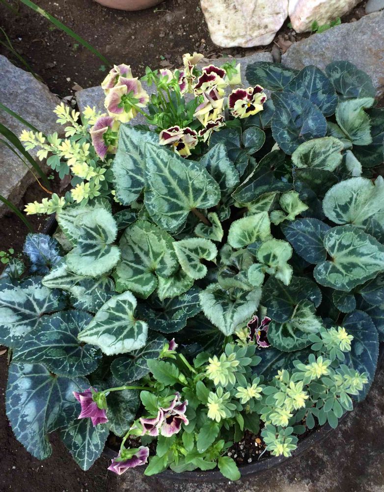 おはようございます☀️🌱昨年のシクラメンの葉がモリモリ(*•̀ᴗ•́*)و ̑̑その両脇にパンジーとロータスプリムストーンを寄せ植えました