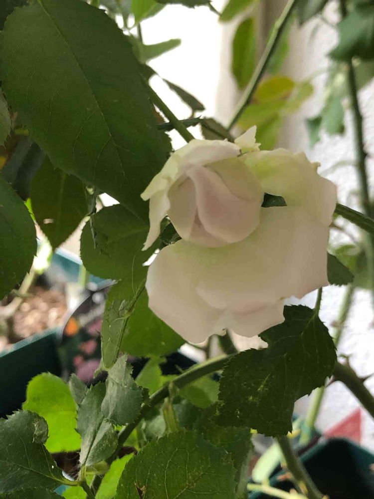 前回は白一色だったけど今回は中心がほんのりグレーかがって咲いてくれそうです🌹✨