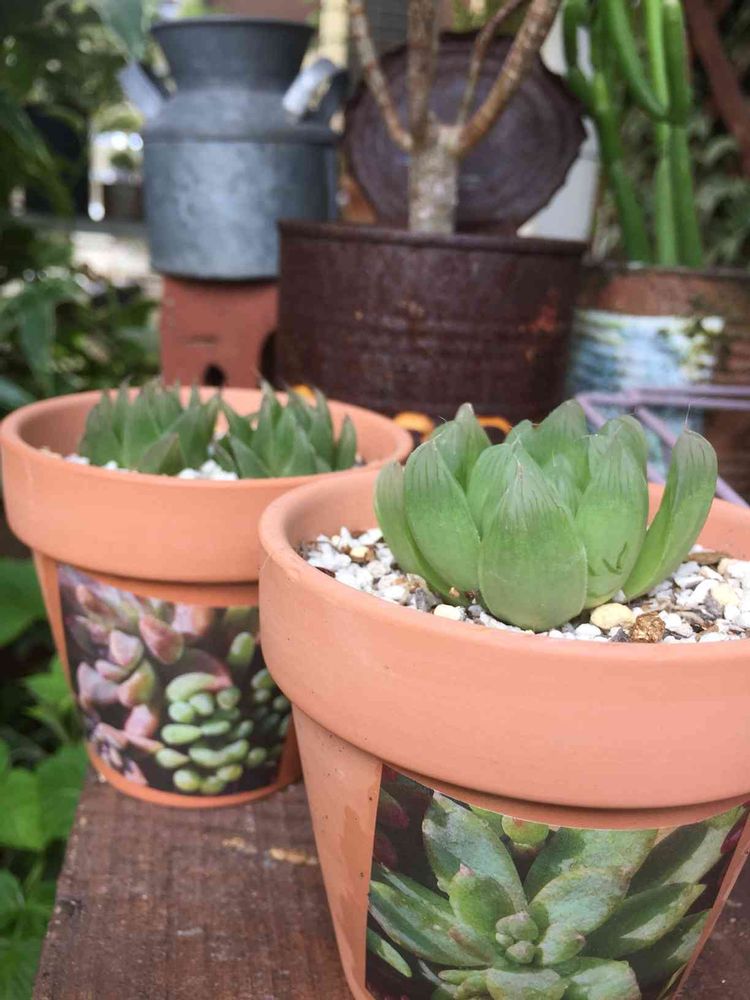 ダイソーの素焼き鉢にダイソーの多肉柄折り紙貼って、ダイソーのハオルチア植える笑。