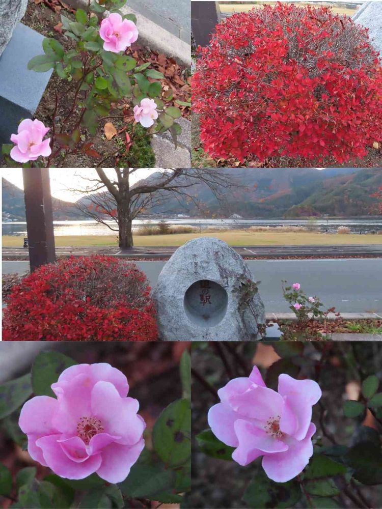 湖の近くの石碑の両脇に紅葉とピンクのお花が咲いていました💕