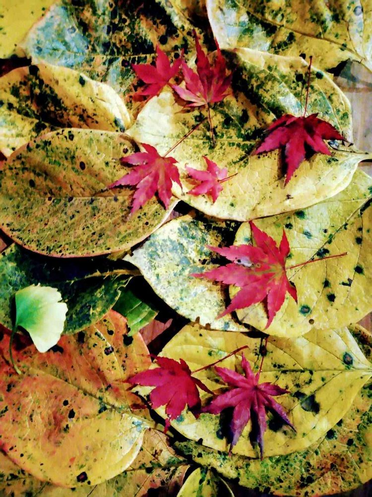 今朝の葉っぱが気に入りまして少し集めてきました。イチョウを一枚とモミジ少々トッピング😅