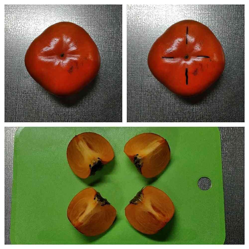 柿を切る時に、タネを切らない方法があるようです。へこんで線になっている所、マジックで書くと、この部分的だよ。ここを切るとタネを切らないらしいよ~。切ってみると、ほらね。ほんとかな~。
