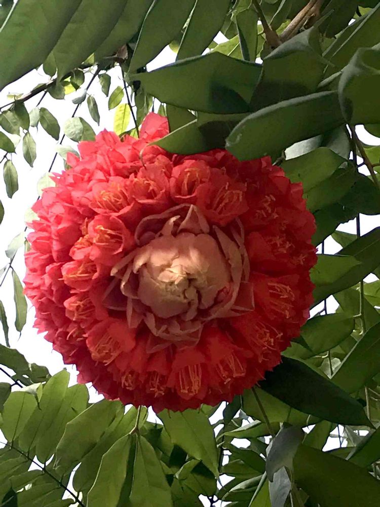 やっと名前わかった❗️ベネズエラのバラBrownea grandiceps 。香港パークの木に咲いてました