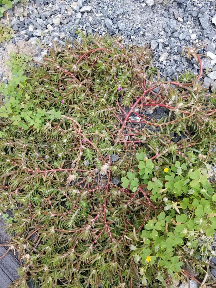 庭に生えた雑草です。生命力が強く、根っこが残っているとまた生えてきました。多肉植物っぽくてプチプチした赤い茎と葉です。葉の付け根は産毛が生えてます。これは何の植物でしょうか?