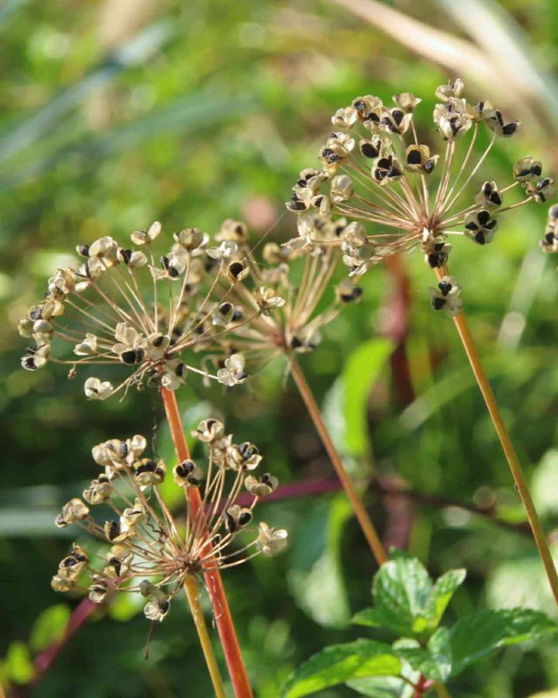 ニラは、花後に果実を結び、熟すと割れて中から6個の黒色の小さな種を散布する。