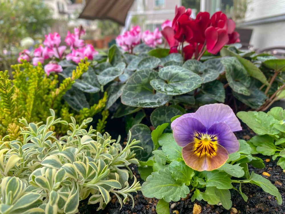 以前、生田園芸さんからお迎えしたガーデンシクラメンを自家採種ビオラと寄せ植えにしました😊✨🌼