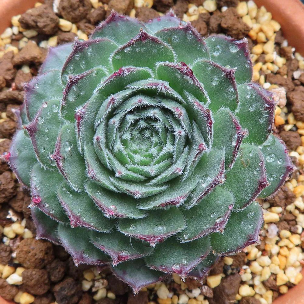 先週株分けしたセンペルビウムのラズベリーアイスの水やり後の姿。同じ名前のエケベリアがうちにいるけど,形も色もどっちも好みで甲乙付けがたい。