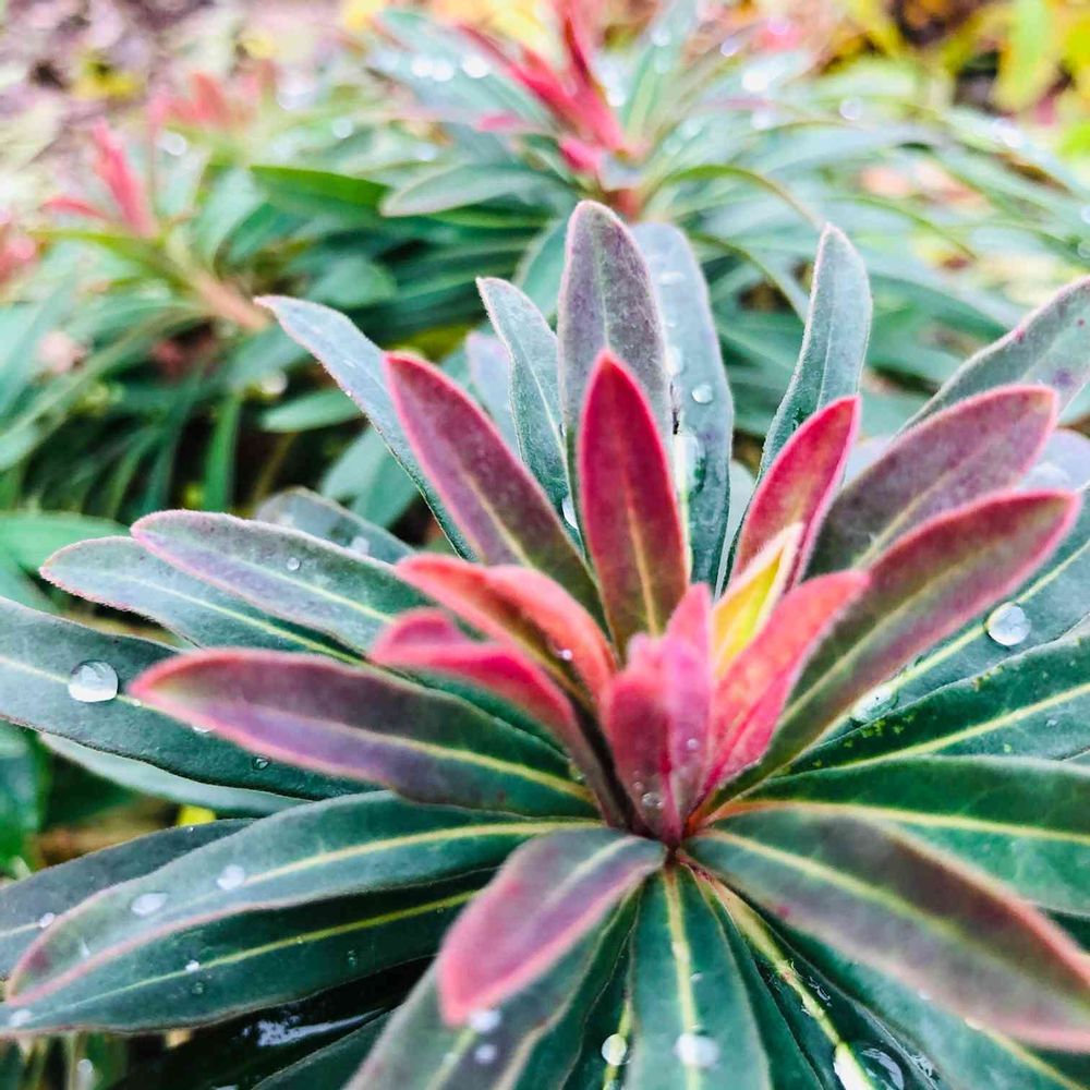 少し深緑の葉が上の方で赤くなり、銀色の雫が光ってとっても綺麗です✨