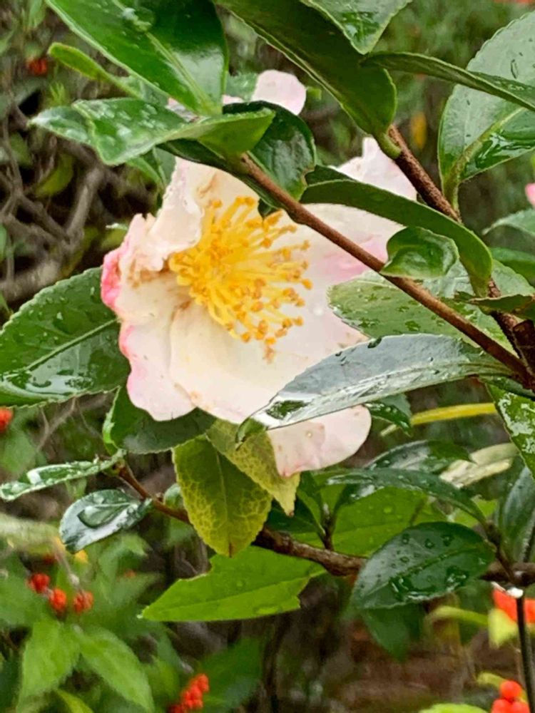 雨に打たれたサザンカ 清楚で可憐で好きな花です。雨に濡れるとよりはかなげで色っぽい⁉️