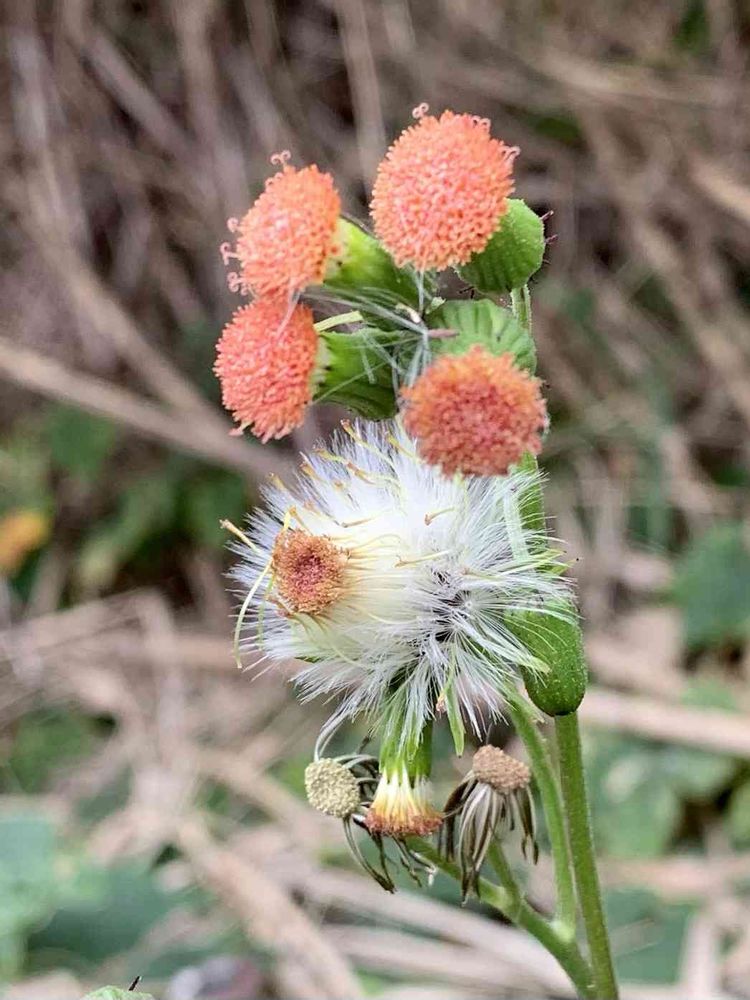 家の前の道端、人知れず紅花襤褸菊が綿毛を飛ばしています。