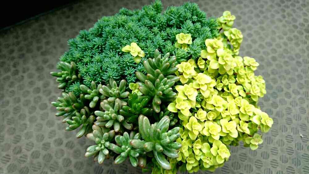 セダム属 オーロラ、ヒスパニクム、黄金丸葉万年草の寄せ植え。😁⤴