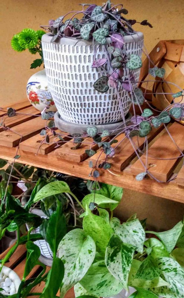 ハートカズラも可愛いし、下段の斑入りポトスが素適〜😍 ポトスは私が初めて育てた観葉植物なんだ🎶