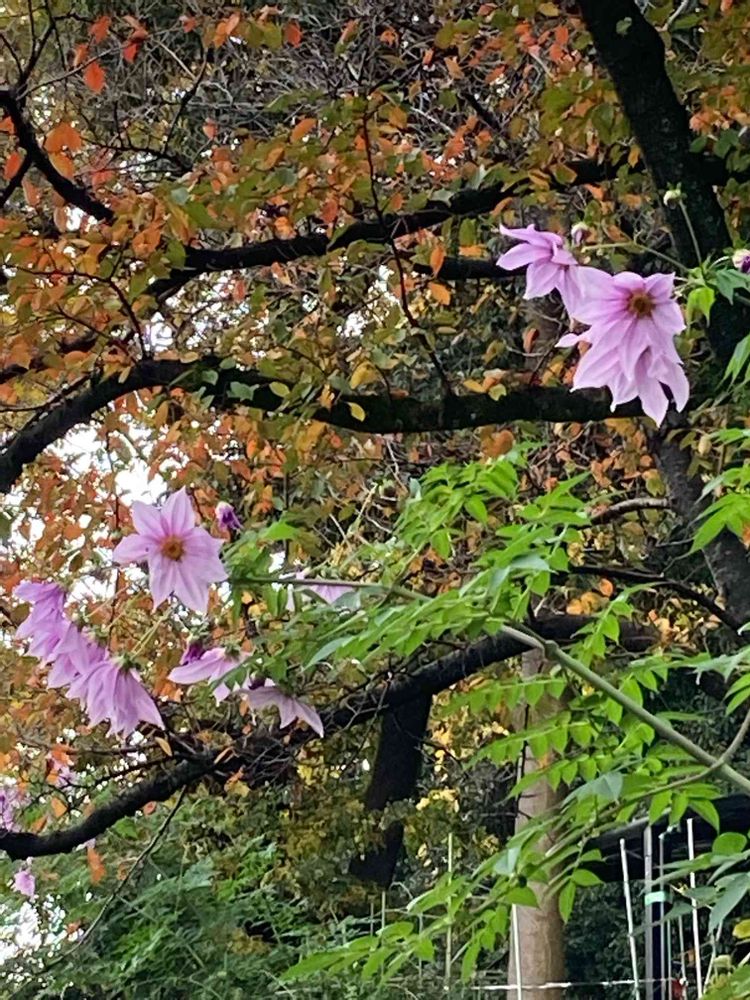 紅葉した木と皇帝ダリアがマッチング。素敵な一場面です。