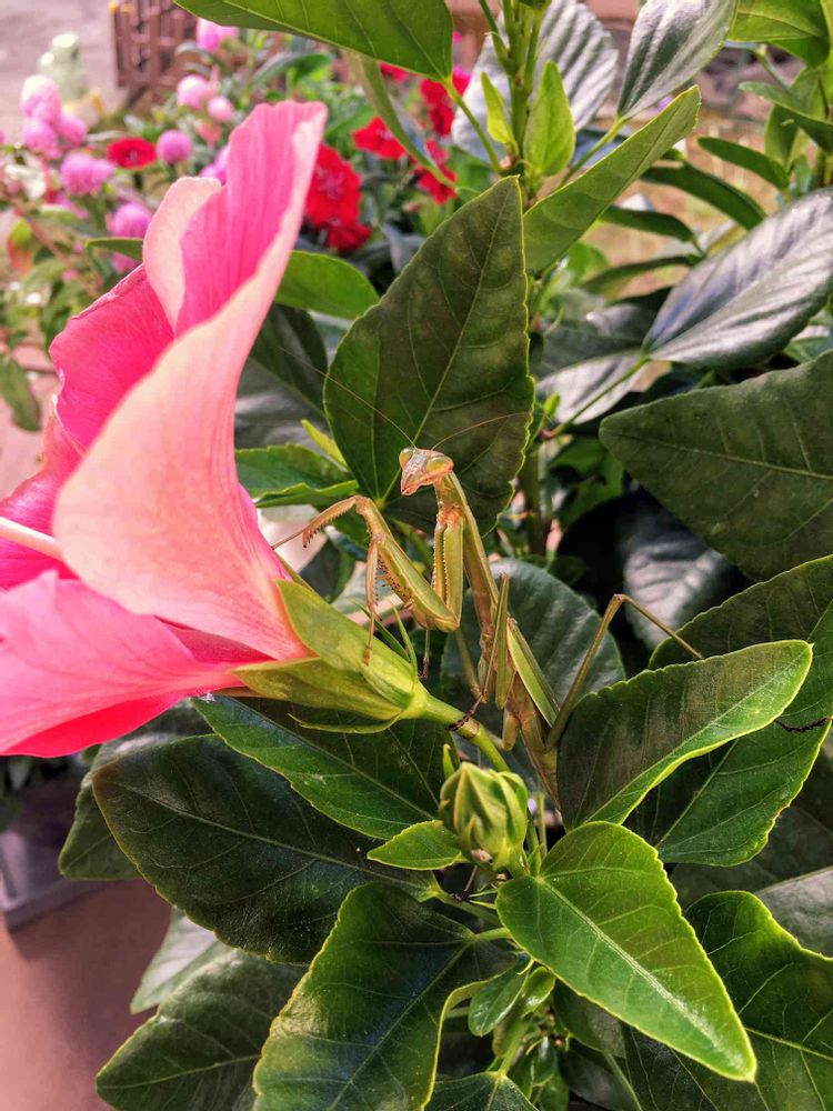 カマキリさん、ハイビスカスの色に染まってる⁉️少し反射でか、ピンクっぽく見えるのは気のせい❓️