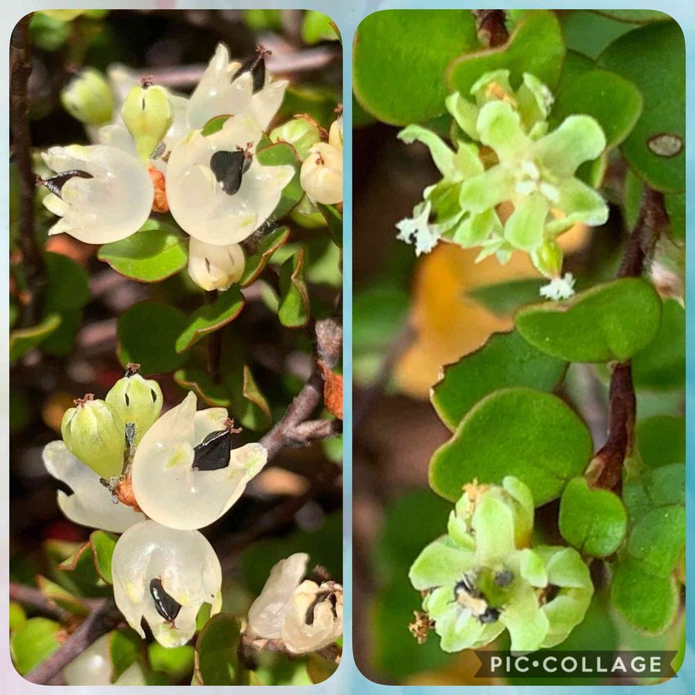 ワイヤープランツにはかわいい葉の他にも、見どころがありますね。緑の小さなお花。それから白い何かと、黒い何か。