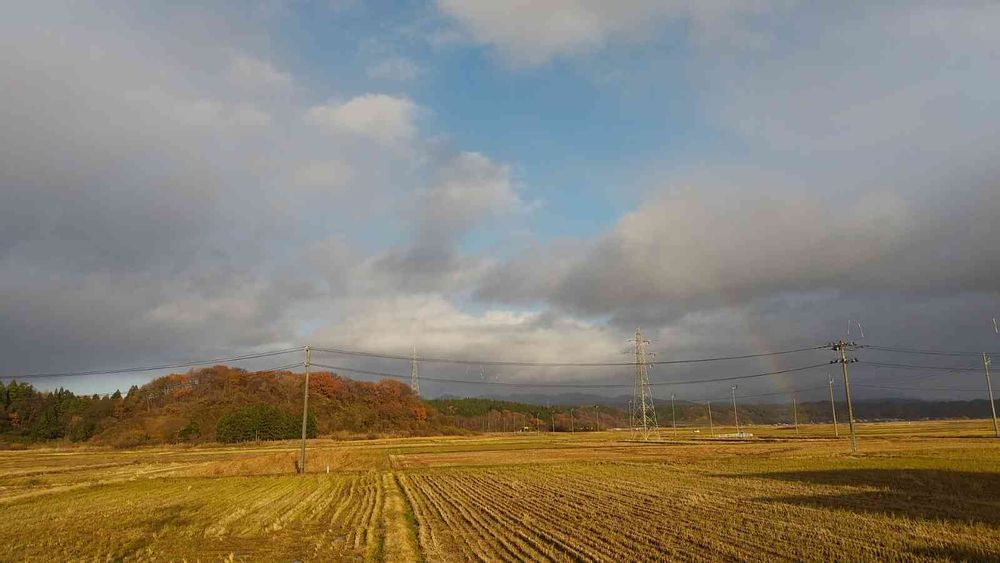 稲刈りの終わった田んぼ!刈り取り後が黄金色!遠くの山の紅葉🍁雲の合間の青空🌈